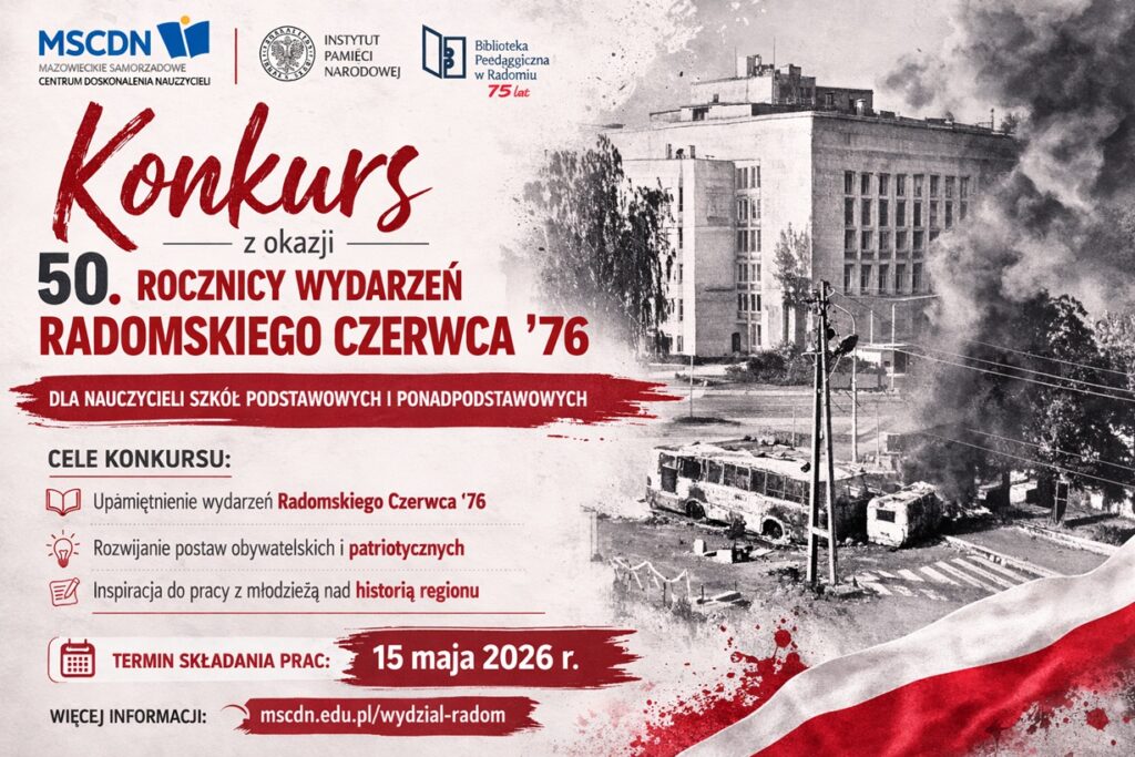 Mazowieckie Samorządowe Centrum Doskonalenia Nauczycieli – Wydział w Radomiu, we współpracy z Instytutem Pamięci Narodowej Delegaturą w Radomiu oraz Biblioteką Pedagogiczną w Radomiu, zaprasza nauczycieli szkół podstawowych i ponadpodstawowych do udziału w wyjątkowym konkursie edukacyjnym poświęconym 50. rocznicy Radomskiego Czerwca 1976.